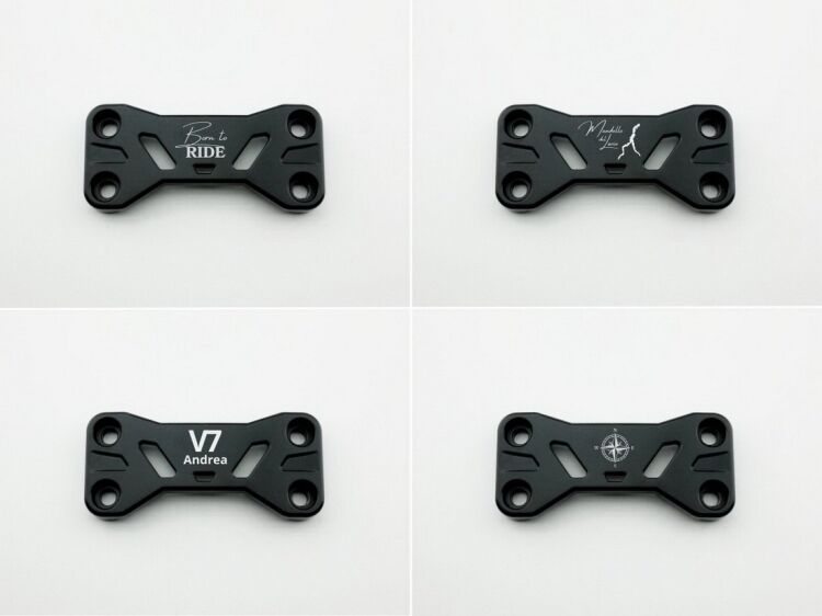 Horní příruba řídítek od Mistral Special Parts je vyrobena z pevného hliníku s matnou černou povrchovou úpravou, která kombinuje pevnost a styl. Je plně zaměnitelná s originální přírubou a nevyžaduje žádné úpravy motocyklu ani nastavení řídítek. Je plně přizpůsobitelná a lze na ni laserem vygravírovat frázi nebo grafiku podle vašeho výběru, což vašemu motocyklu dodá jedinečný a exkluzivní nádech.