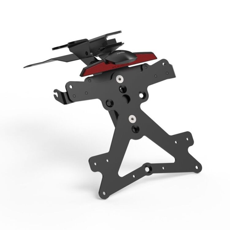 Specifický hliníkový držák SPZ s LED osvětlením a nastavitelným sklonem. Každý držák řady Fox je navržen na míru konkrétnímu modelu motocyklu, což zaručuje dokonalé splynutí s jeho liniemi a snadnou instalaci. Systém kombinuje maximální kompaktnost s plným souladem s platnou legislativou, přičemž nevyžaduje žádné nevratné zásahy do originálních dílů stroje.